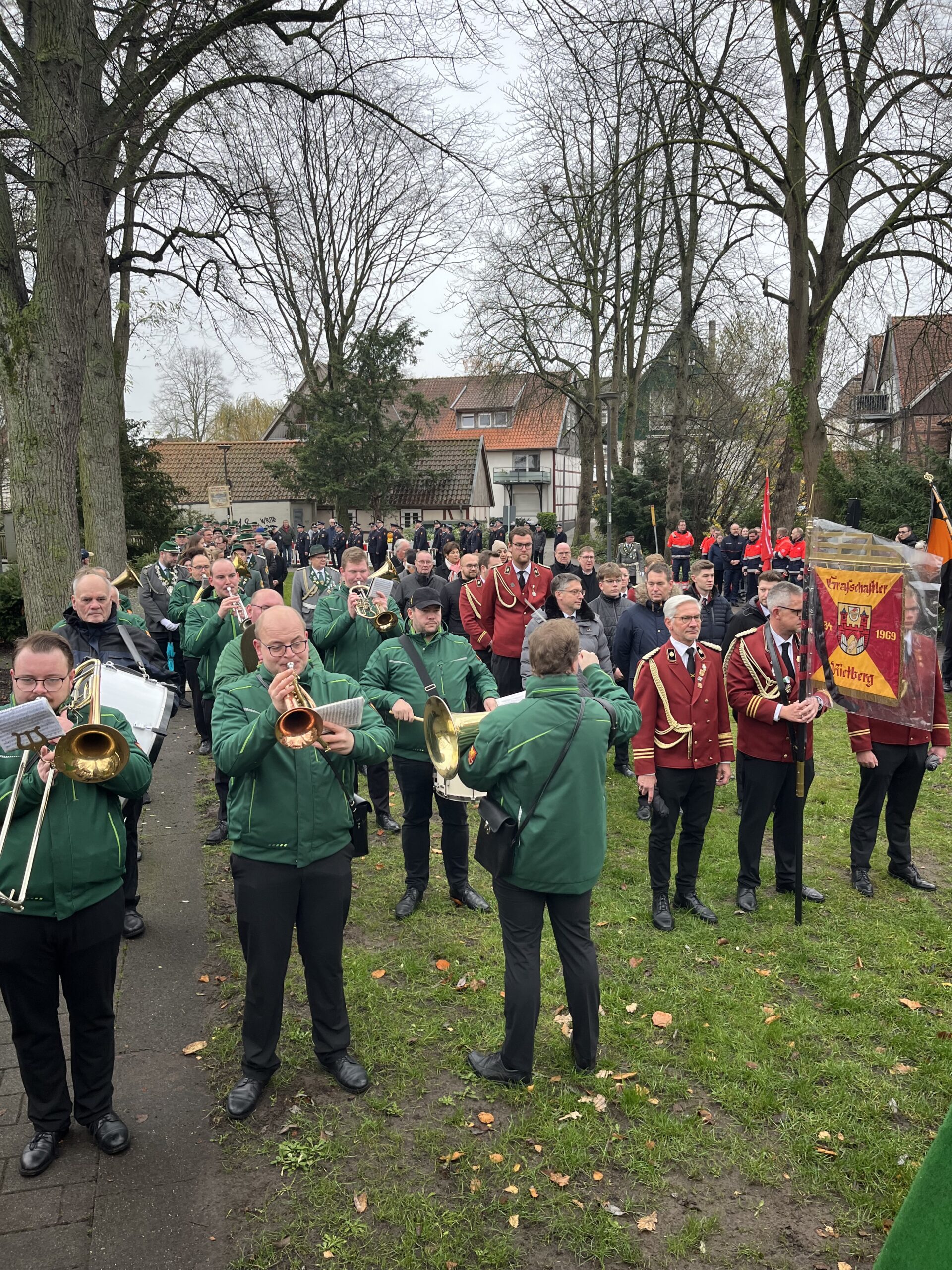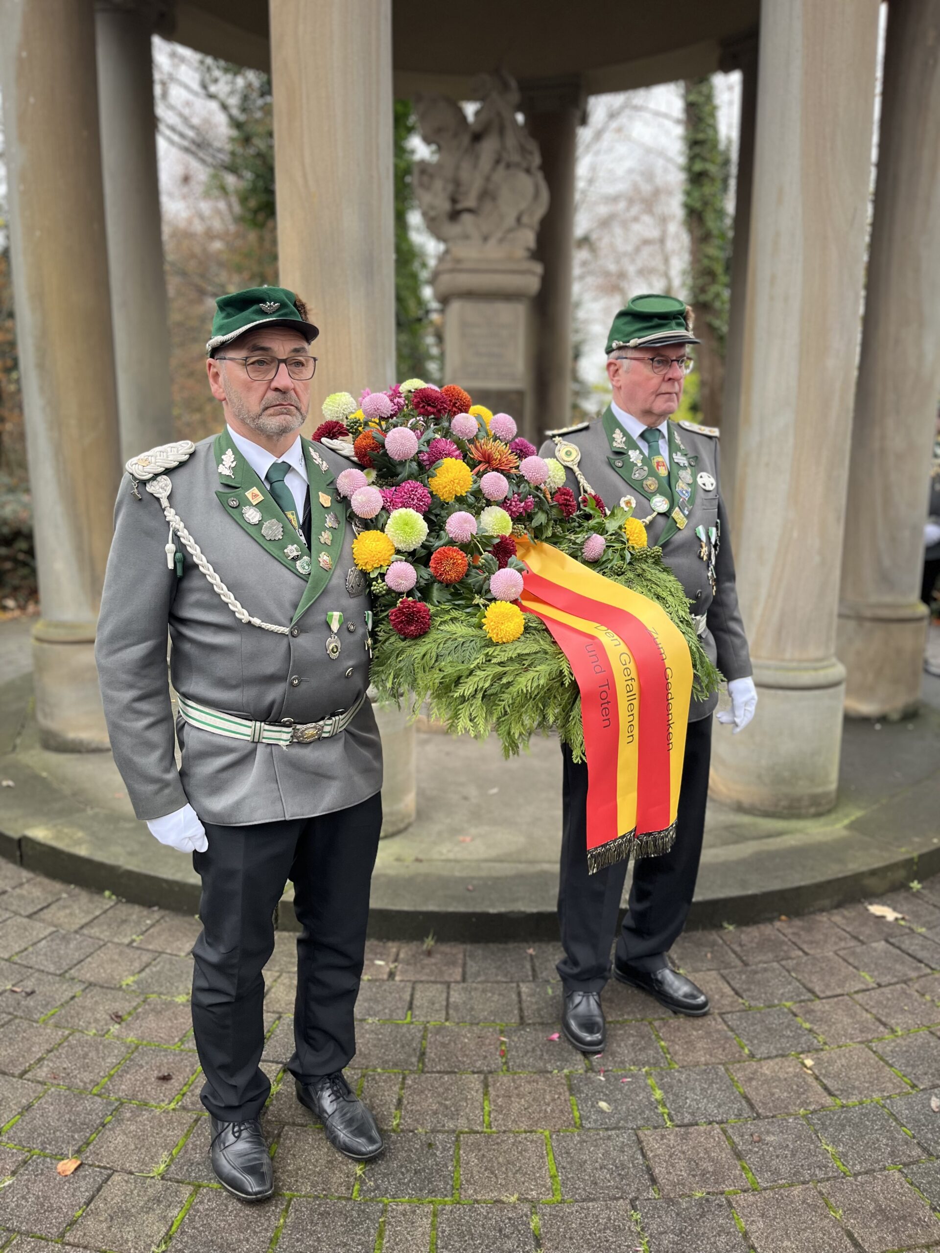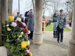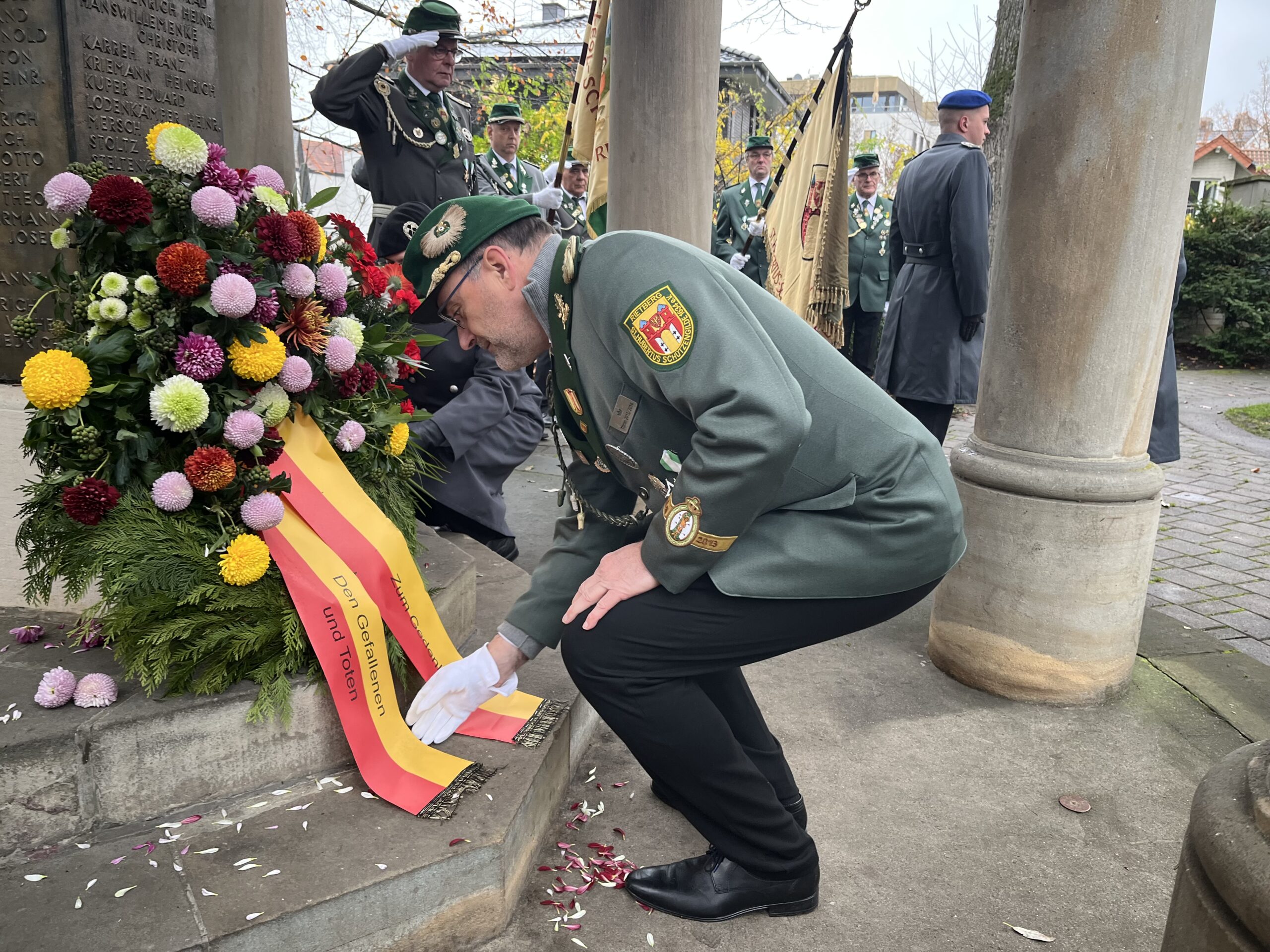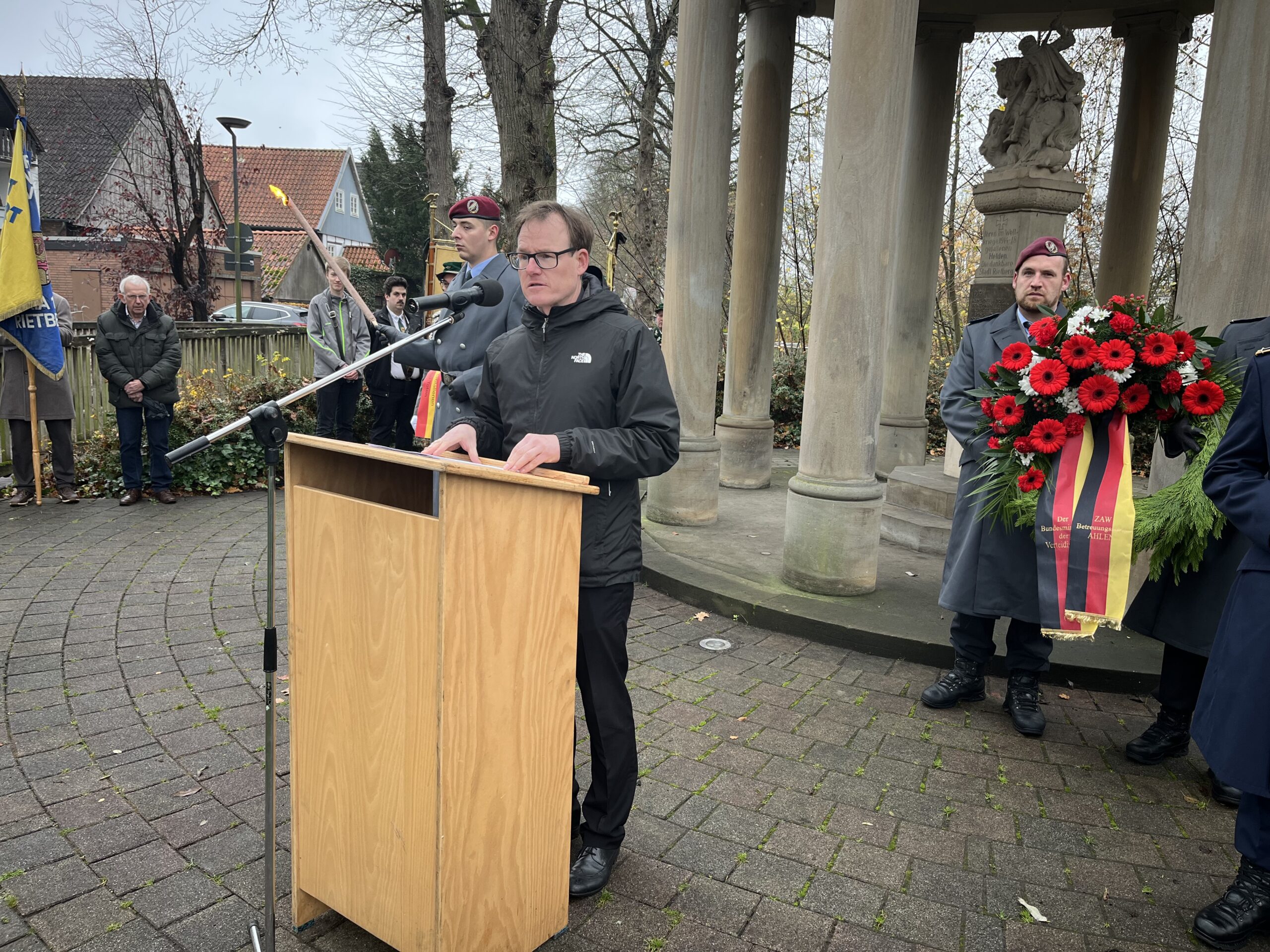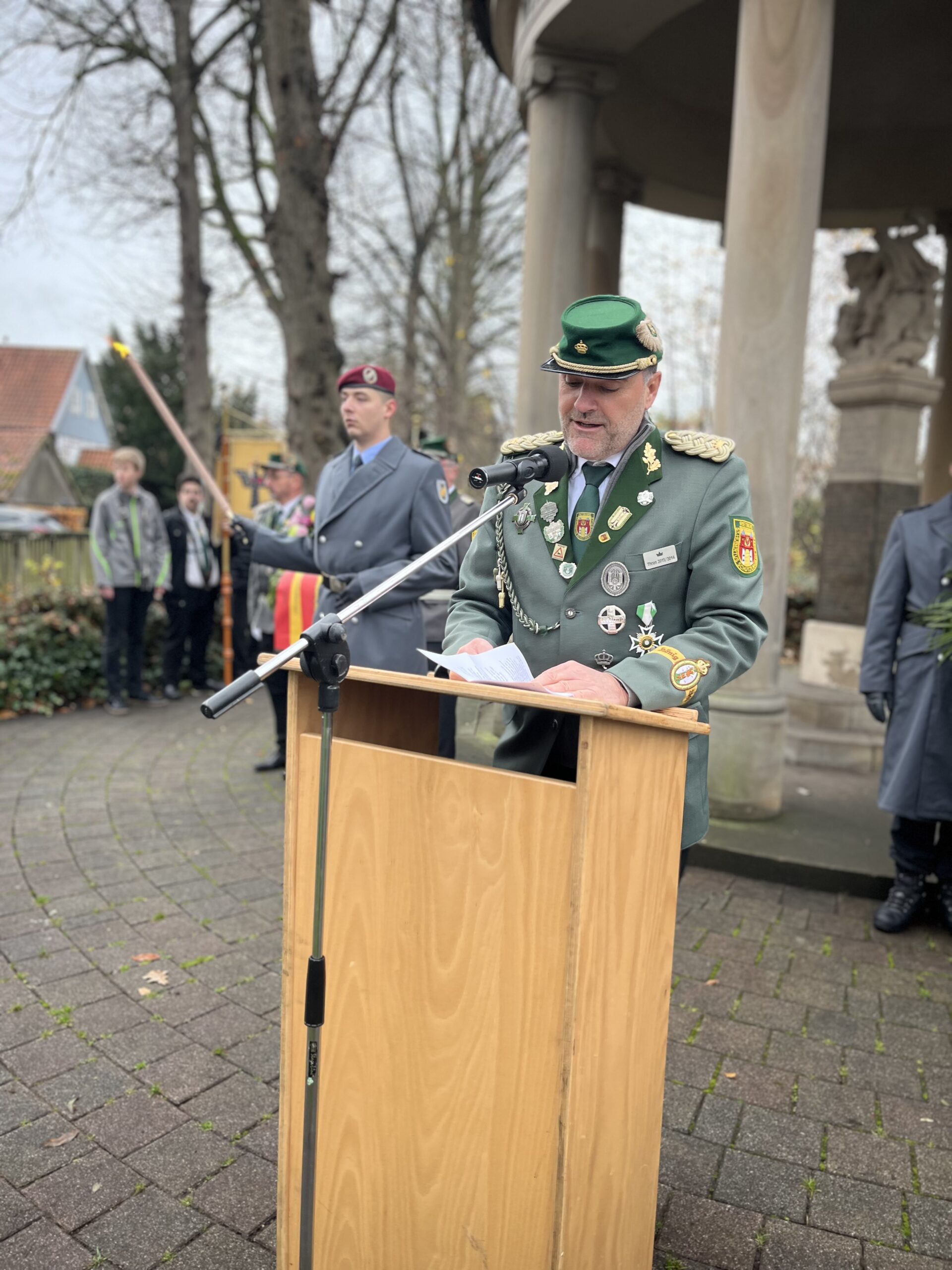 Mit einer feierlichen Gedenkfeier im Rahmen des Volkstrauertages hat die St. Hubertus Schützengilde am Sonntag gemeinsam mit der Stadt Rietberg und zahlreicher Vereine an die Opfer aller Weltkriege gedacht. Jens Effkemann, Regionalgeschäftsführer vom Volksbund Kriegsgräberfürsorge, appelliert in seiner Rede, den Frieden zu wahren und Konflikte zu lösen.