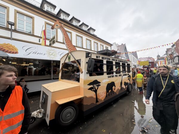 Unter dem Motto „Safari“ verwandelte der Thron den Umzug in eine kleine Expedition: Herzstück war ein aufwendig gestalteter Safari-Bus, der unter anderem eine über das Dach hinausragende Giraffe präsentierte. Die kreative Eigenleistung sorgte entlang der Strecke für zahlreiche staunende Blicke und begeisterten Applaus.